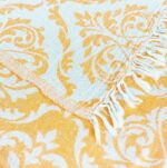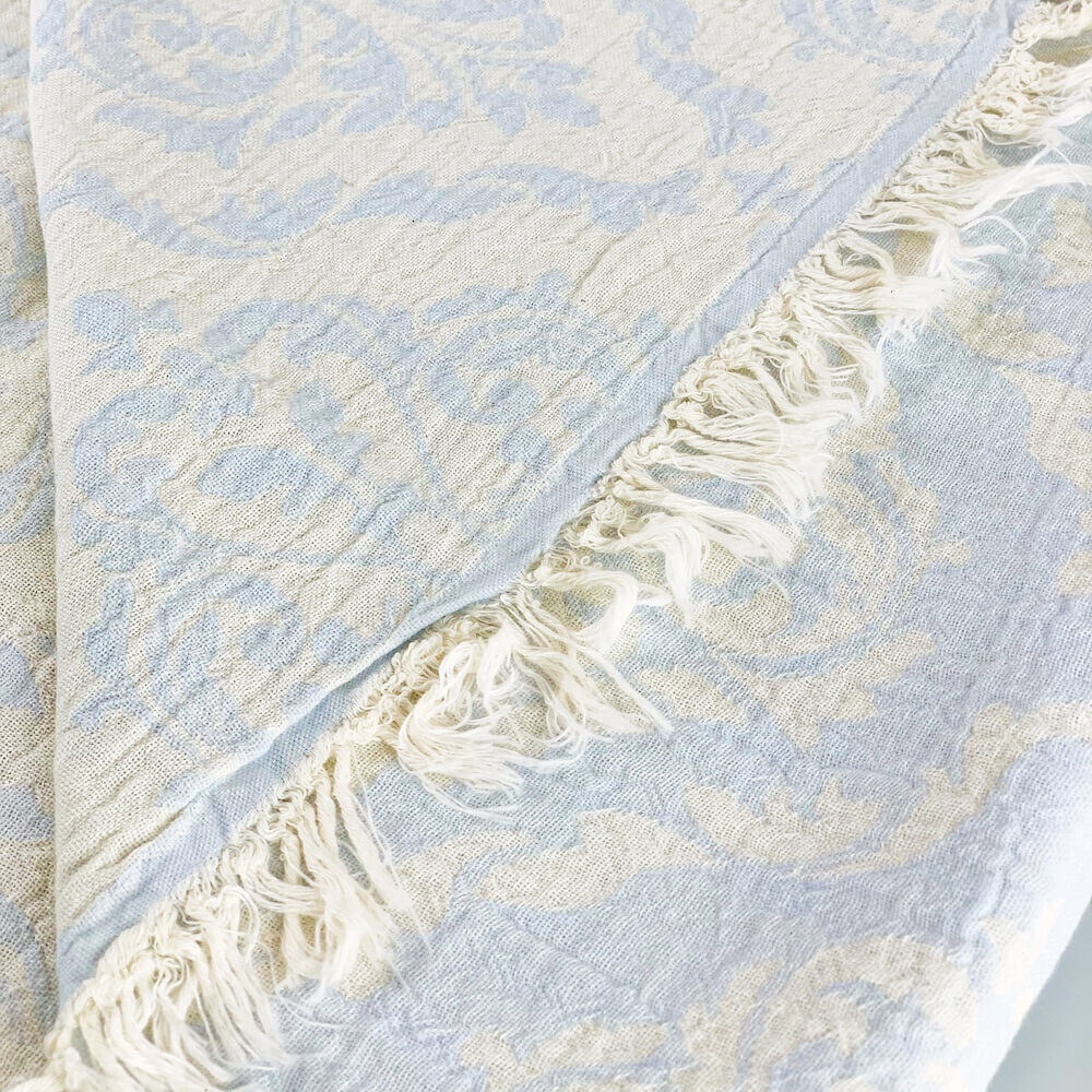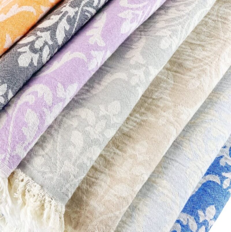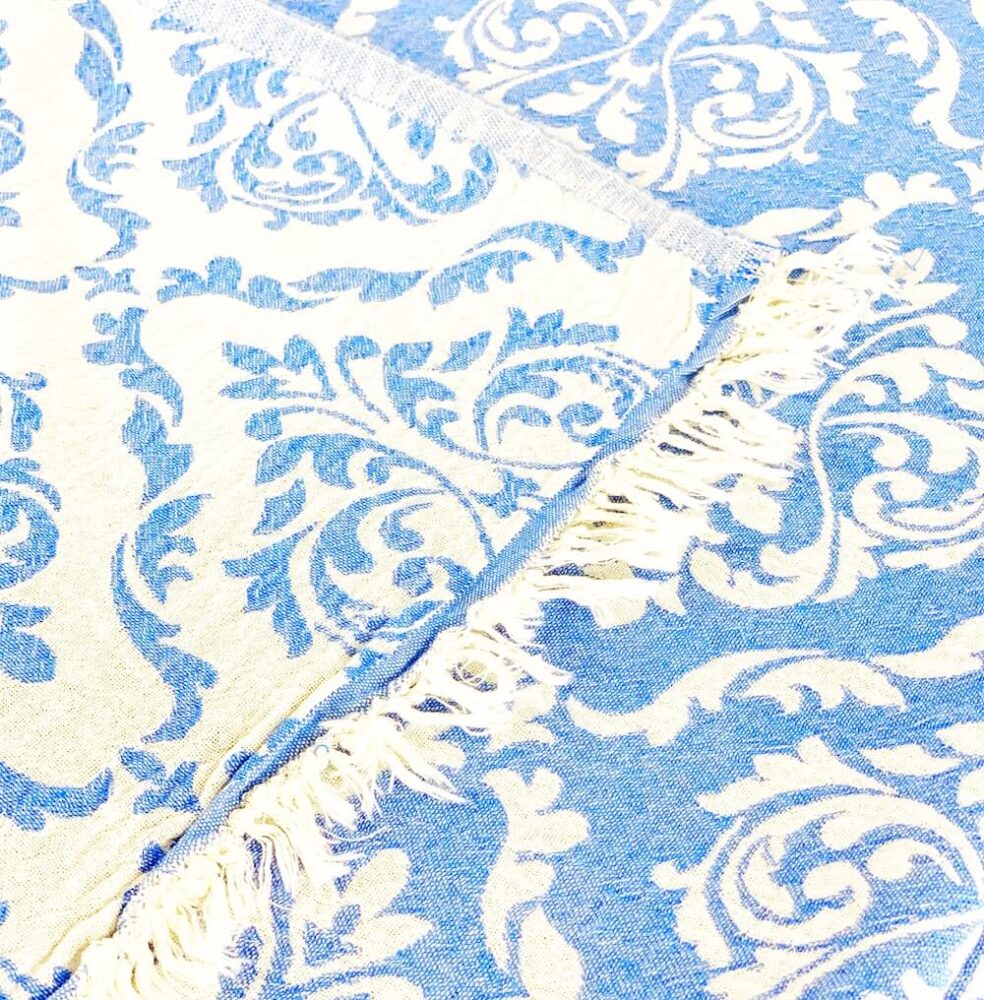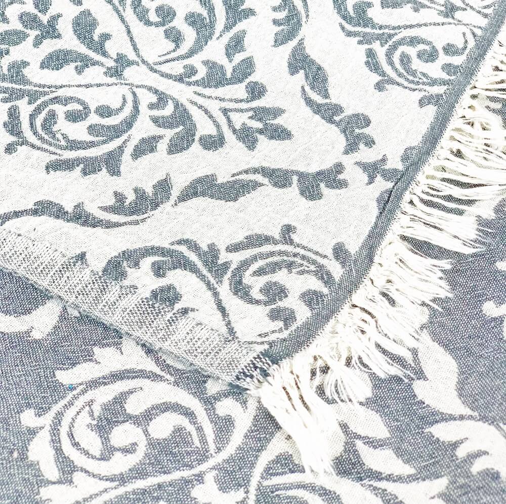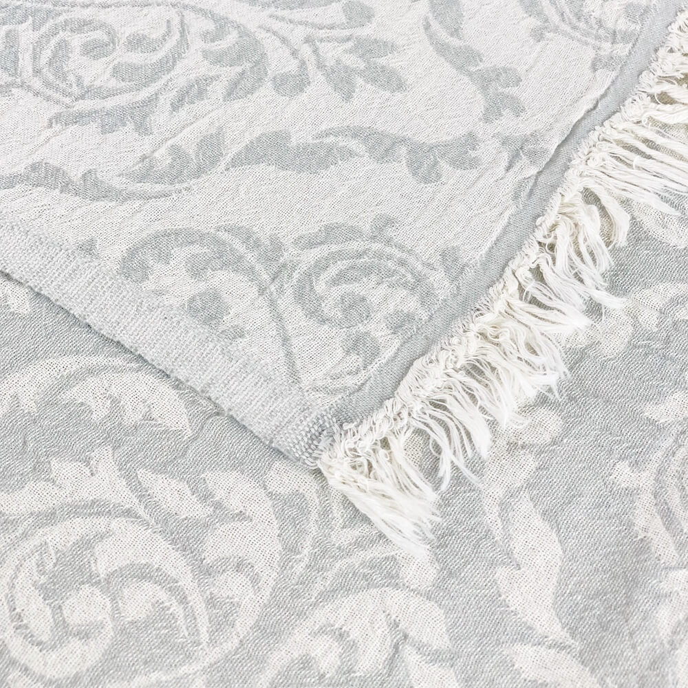 Pestemal Chrome ist flauschig weich und in Jacquard-Technik gewebt. Pestemal Chrome ist ein im zweilagig gewebtes Tuch im Vintage-Style. Das Badetuch ist mit der Jaquard-Technik gewebt dadurch entstehen diese aufwendigen Muster. Das Tuch wird mit feinen Baumwollfäden zweilagig verwebt, wodurch das Tuch ein hauchzartes Gewebe mit feinem Volumen bekommt und angenehm weich, leicht und fluffig im Griff ist. Beide Tuchseiten sind mit einem ansprechenden grossen Barockmuster versehen. Badetuch Chrome ist trotzdem leicht und ein sehr weiches Tuch. Durch das doppelte Weben ist es “wolkenweich” und hat mit den kurzen offenen Fransen einen speziellen Charakter. Das Badetuch ist bereits schon vorgewaschen und aus diesem Grund geht es beim Waschen nicht mehr gross ein. Badetuch Chrome ist mit seinem edlen Barockmuster ein stillvolles, anschmiegsames und blickdichtes edles Pestemal in einem Vintage Stil. Das Badetuch ist einfach ein Must-Have für wellnessbegeisterte oder die exklusiven Design lieben!