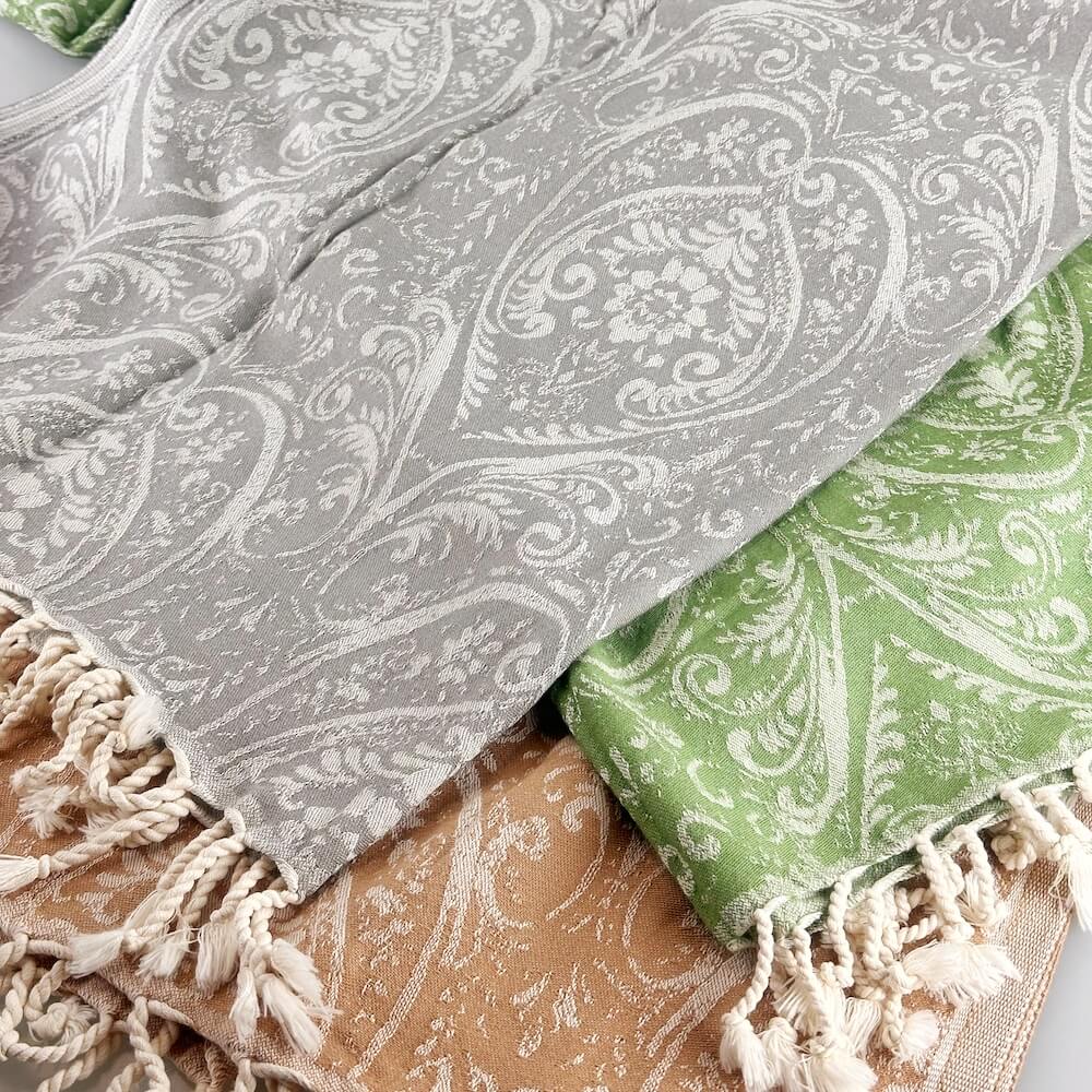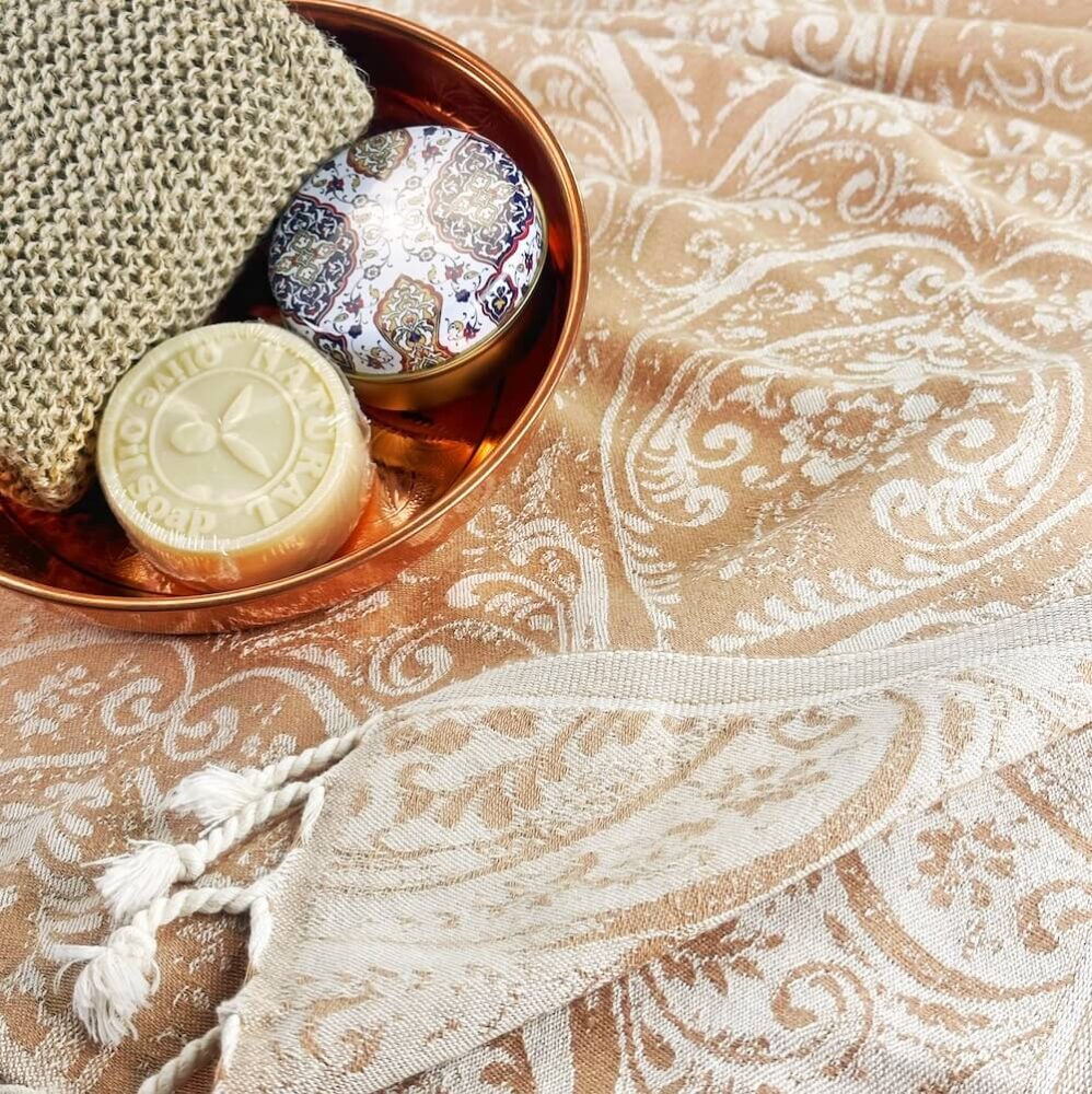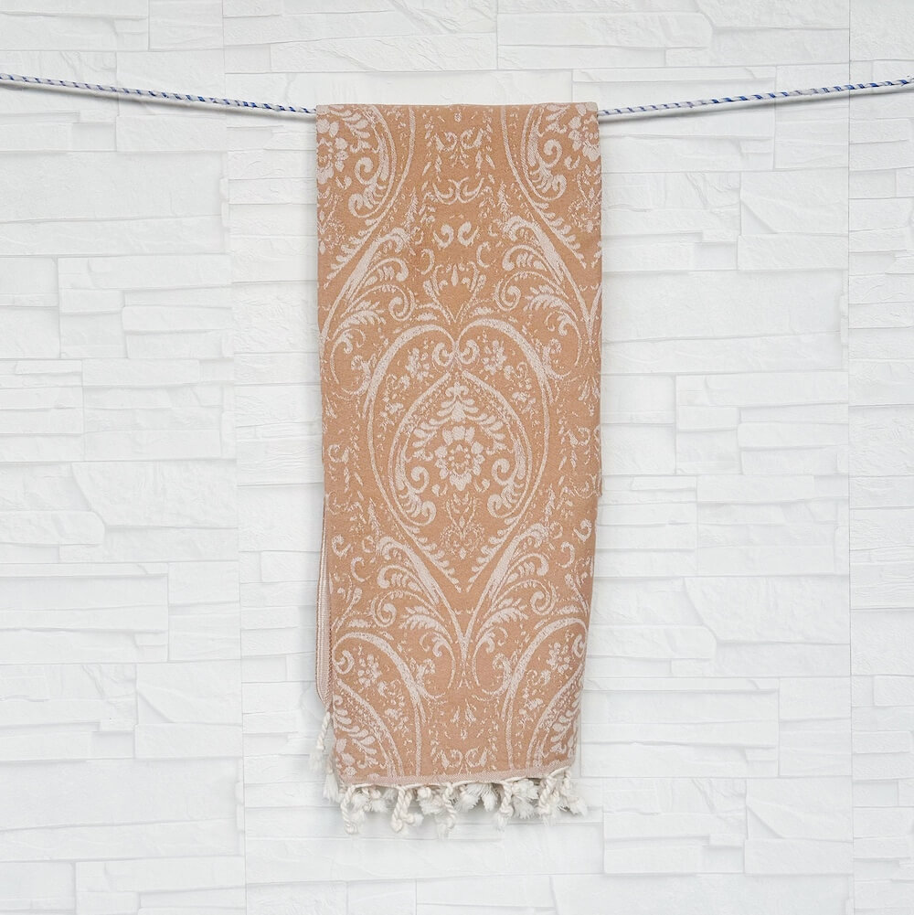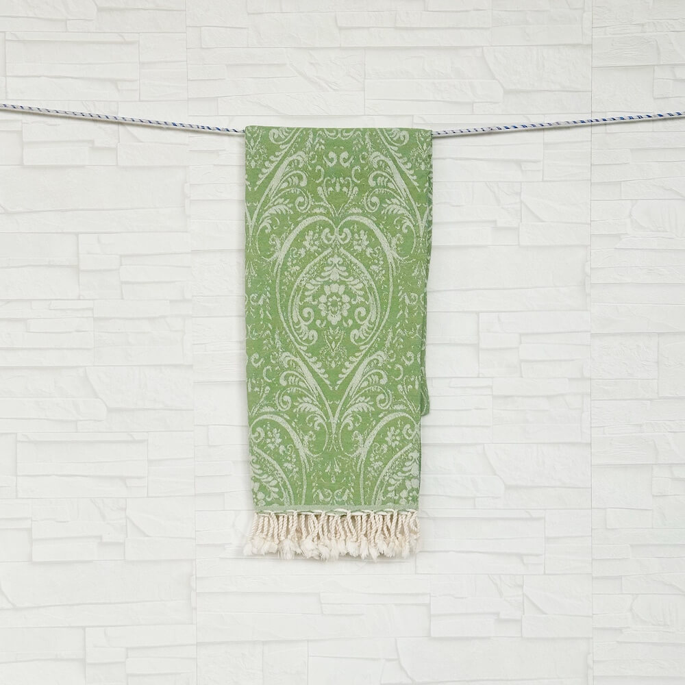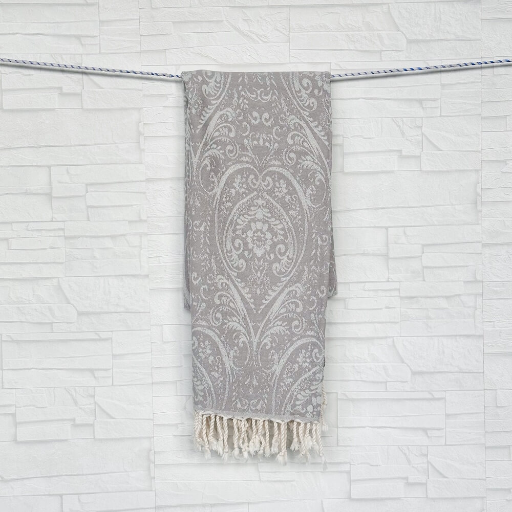 Hamamtuch Gatria ist aufwendig in Jaquard Webung gewoben mit einem edlen Barock Muster. Gatria Hamamtuch aus hauchzartem Gewebe und flauschig weich und absolut saugstark. Dieses kuschelige Hamamtuch schmiegt sich an den Körper an und fühlt sich angenehm soft auf der Haut an. Gatria kann man vielseitig einsetzen besonders super eignet sich es als Sauna-Tuch beim Wellnessen, als Badetuch, Strandtuch oder als modisches Accessoire als Überwurf für den Sessel.